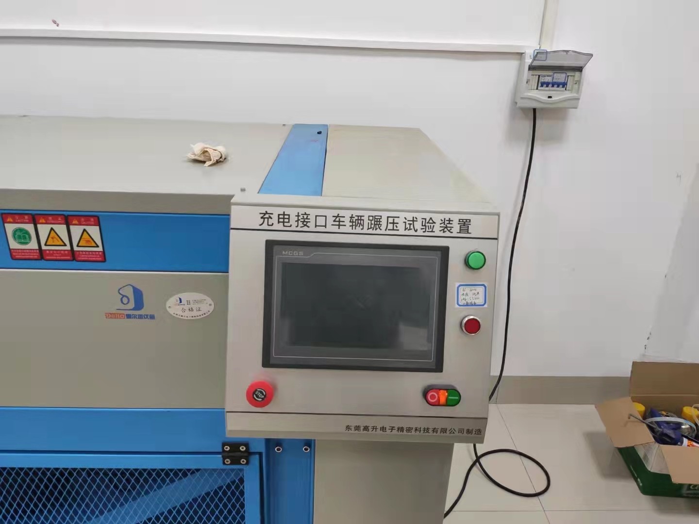 充電樁插頭模擬碾壓試驗(yàn)裝置將帶有制造商推薦的電纜的供電插頭和車(chē)輛插頭隨意地放在水泥地上,用規(guī)格為P225/75R15同等負(fù)載的汽車(chē)輪胎以(5000±250)N的壓力,以(8±2)km/h的速度壓過(guò)供電插頭或車(chē)輛插頭(輪胎充氣壓力220±10kPa),以模擬測(cè)試供電插頭或車(chē)輛插頭承受車(chē)輛碾壓的能力。
