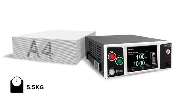 A4面積的尺寸設計,便于任何空間擺設配置,搭配重量僅5.5公斤可堪稱市場上最輕巧的耐壓測試儀,不但讓用戶攜帶方便更增加器材的使用彈性。
