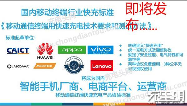 今后國(guó)內(nèi)快充協(xié)議繁多、相互不兼容的局面很快就會(huì)被打破,由中國(guó)信息通信研究院、泰爾終端實(shí)驗(yàn)室發(fā)起的《移動(dòng)通信終端用快速充電技術(shù)要求和測(cè)試辦法》即將發(fā)布。