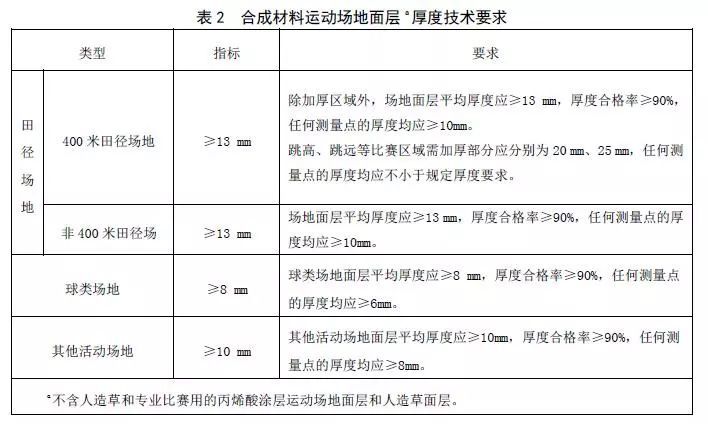 (2)為了保證合成材料面層運動場地能達到相應(yīng)的安全保護性能和耐用性能,本標準結(jié)合現(xiàn)行國家標準和國際標準,對面層厚度作出如下要求: