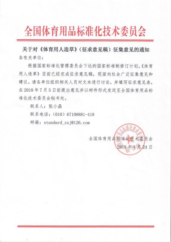 任務來源:根據國家標準化管理委員會下發(fā)的《<招標采購代理服務規(guī)范>等406項國家標準修訂計劃的通知》要求,《體育用人造草》標準已列入國家標準制修訂計劃并下達,計劃編號:20172300-T-469,為推薦性國家標準。