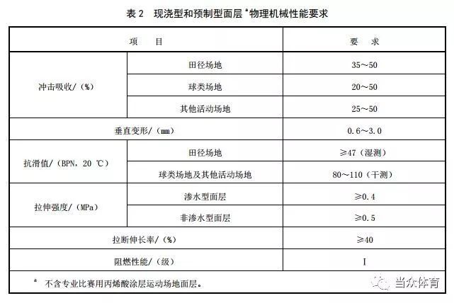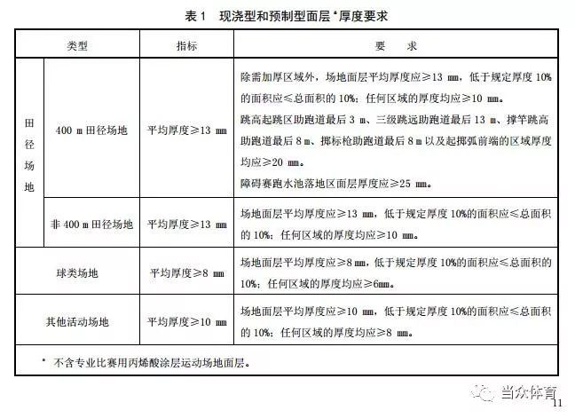 原標(biāo)準(zhǔn) GB/T 19851.11-2005 | 田徑場(chǎng)(混合型):≥10 田徑場(chǎng)(復(fù)合型):≥11 田徑場(chǎng)(透氣型):≥12 加厚區(qū)≥15 | 籃球場(chǎng) 排球場(chǎng) | 混合型≥7 復(fù)合型≥7 透氣型≥10 | 沒有規(guī)定其它活動(dòng)場(chǎng)地面層的厚度指標(biāo) |