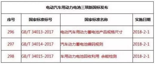 近日,國家質(zhì)量監(jiān)督檢驗檢疫總局、國家標準化管理委員會批準發(fā)布了312項國家標準,其中涉及電動汽車用動力電池相關(guān)標準3項,分別為GB/T 34013-2017《電動汽車用動力蓄電池產(chǎn)品規(guī)格尺寸》、GB/T 34014-2017《汽車動力蓄電池編碼規(guī)則》、GB/T 34015-2017《車用動力電池回收利用 余能檢測》,3項標準已于2018年2月1日實施。