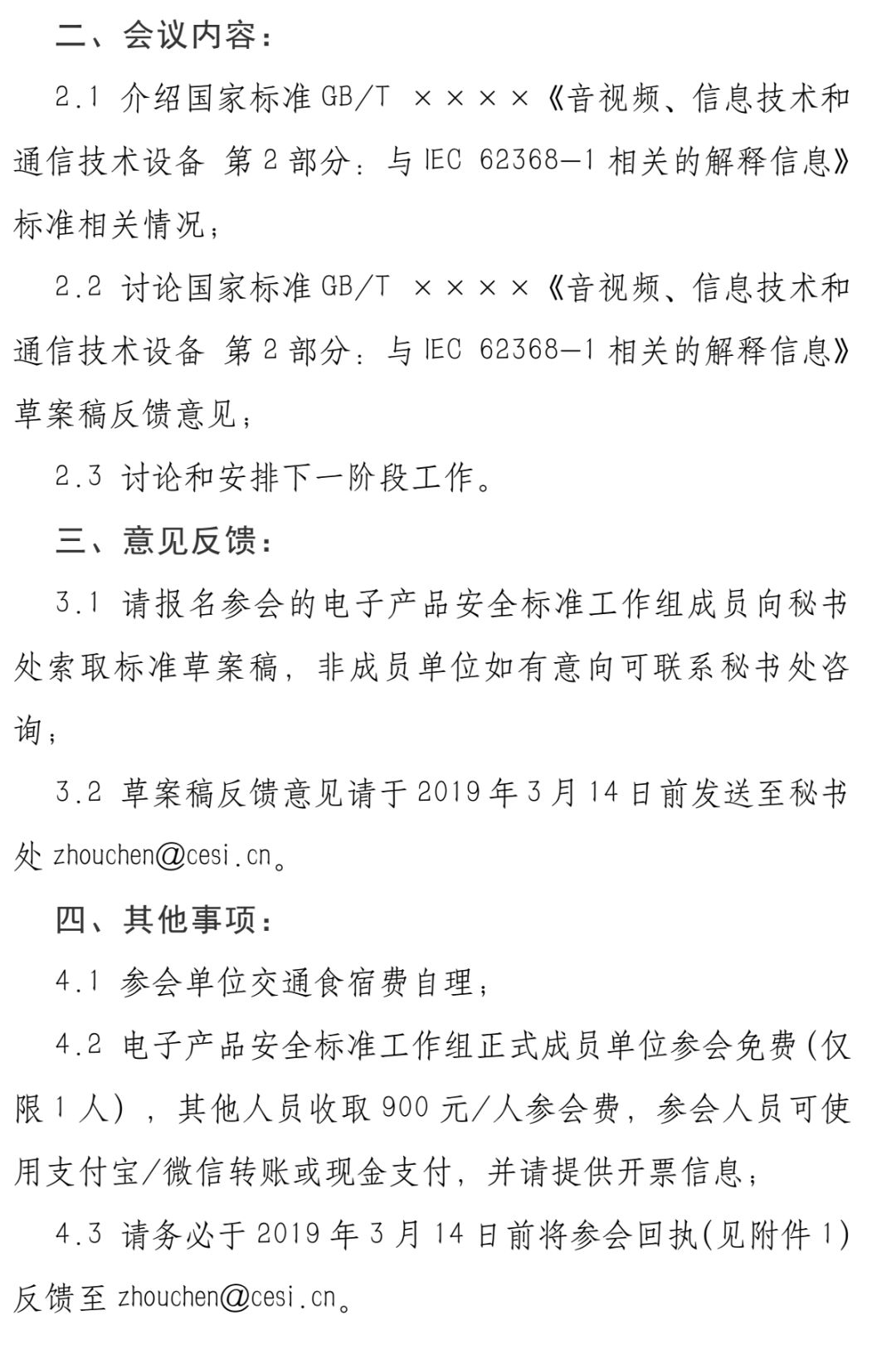 召開《音視頻、信息技術(shù)和通信技術(shù)設(shè)備 第2部分:與IEC 62368-1相關(guān)的解釋信息》草案稿討論會的通知