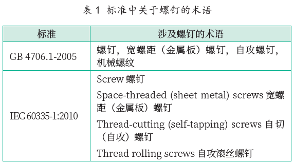 家電產(chǎn)品中常見的連接方式有螺釘、螺栓、壓接、鉚接、焊接、接插件等,螺釘無疑是其中最重要的銜接方式,螺釘在家電產(chǎn)品中的功能主要是固定部件、電氣接和提供接地連續(xù)性的連接,當螺釘用作接地連接時,標準對其要求較高。在國際標準IEC 60335 和國家標準GB 4706 系列標準提到了寬螺距螺釘、自攻螺釘、機械螺紋等多個術(shù)語,見表1。