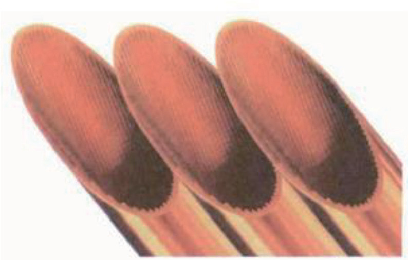 (2)原材料:行業(yè)內(nèi)的銅管通常使用為磷脫氧銅內(nèi)螺紋管,內(nèi)表面增加螺紋的作用是增加內(nèi)表面積,提高傳熱效果,如圖2 所示:牌號TP2,材料狀態(tài)M,來料狀態(tài)LWC。