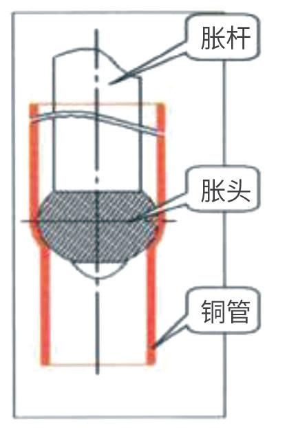 (1)此工序的加工內(nèi)容為采用脹管機(關(guān)鍵模具:脹頭)把銅管的直徑進行擴大,使得銅管和翅片的配合由間隙配合變?yōu)檫^盈配合,翅片可以均勻的排布在銅管的外側(cè),起到強化銅管外表面換熱效果的目的。