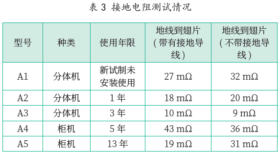 由于空調(diào)是I 類器具,需要有接地措施,衡量產(chǎn)品接地是否可靠,通過接地電阻測試可以反應(yīng)出來,由于接地導(dǎo)線是連接壓縮機底座與電氣盒,而壓縮機是與管路相連接,我們將該接地導(dǎo)線取消前、后來反映銅管與翅片的接地電阻數(shù)據(jù)。我們對不同使用環(huán)境、年限的產(chǎn)品進行了接地電阻的測試,測試情況如表3。