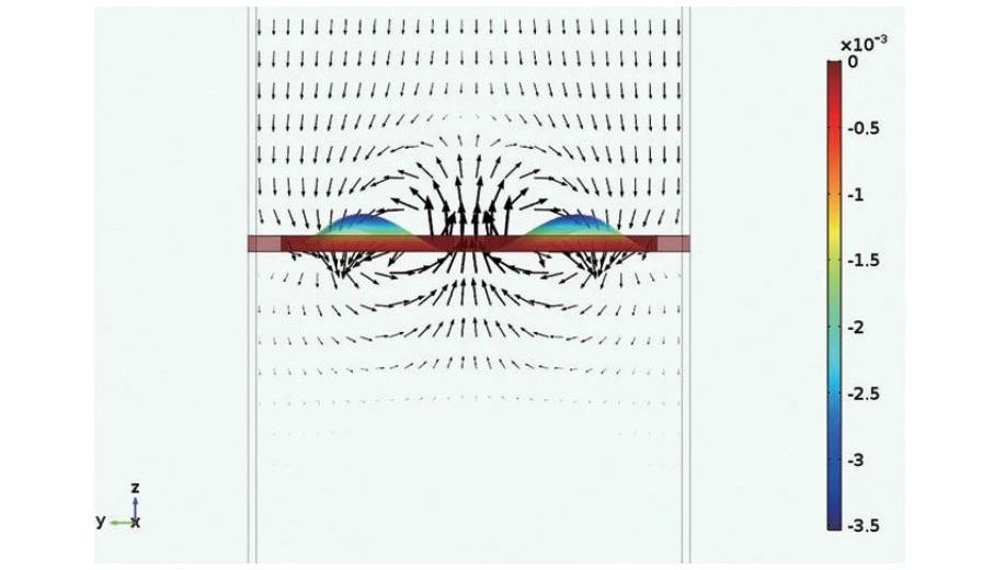 以主要隔聲頻段在440Hz為例,通過COMSOL仿真,分別作出隔聲峰值左右相鄰頻率(420Hz、460Hz)的聲場聲強分布圖,圖中的箭頭指向和疏密代表聲強的方向和強弱。從云圖可以看出,方形圓孔結(jié)構(gòu)的聲學(xué)超材料單元,其通過四周膜的聲場分量和通過中間孔的聲場分量相互干擾,聲波能量傳播呈現(xiàn)出漩渦狀。如圖2所示,420Hz(<440Hz)時聲波能量通過孔向下傳播;如圖3所示,當(dāng)頻率為460Hz(>440Hz)時,聲波能量透過薄膜向下傳播;在中間頻率(440Hz),這兩部分聲波的相互抵消干擾達(dá)到最大,它們疊加形成的總聲場聲功率最小,因而隔聲量最大。