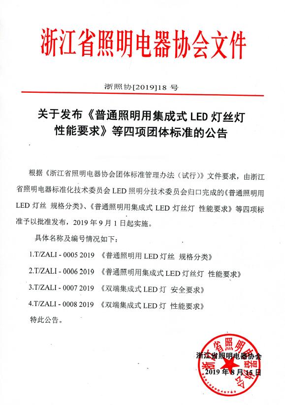 根據(jù)《浙江省照明電器協(xié)會團體標準管理辦法(試行)》文件要求,由浙江省照明電器標準化技術(shù)委員會LED照明分技術(shù)委員會歸口完成的《普通照明用集成式LED燈絲燈 性能要求》《道路照明用LED燈技術(shù)規(guī)范》兩項標準予以批準發(fā)布,2019年9月1日起實施。
