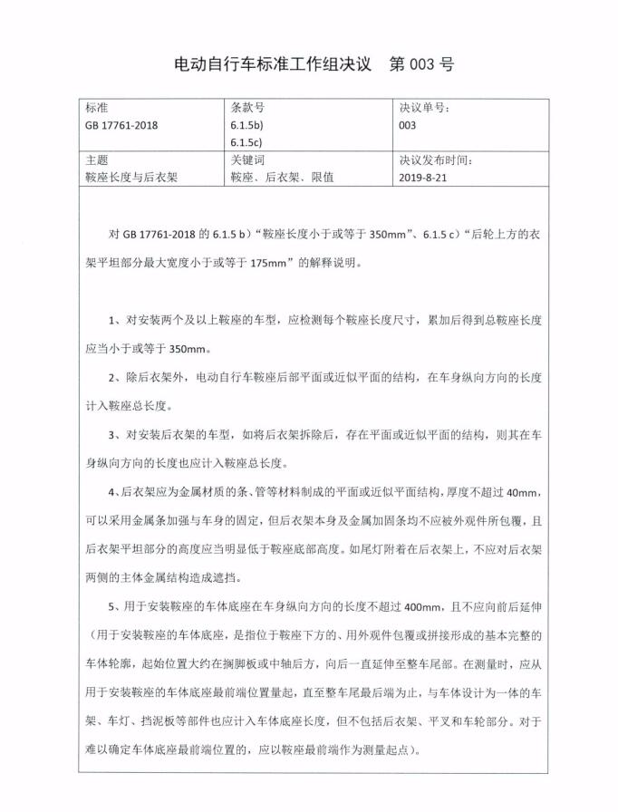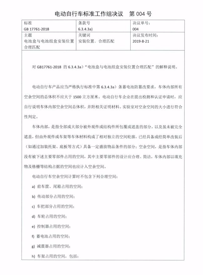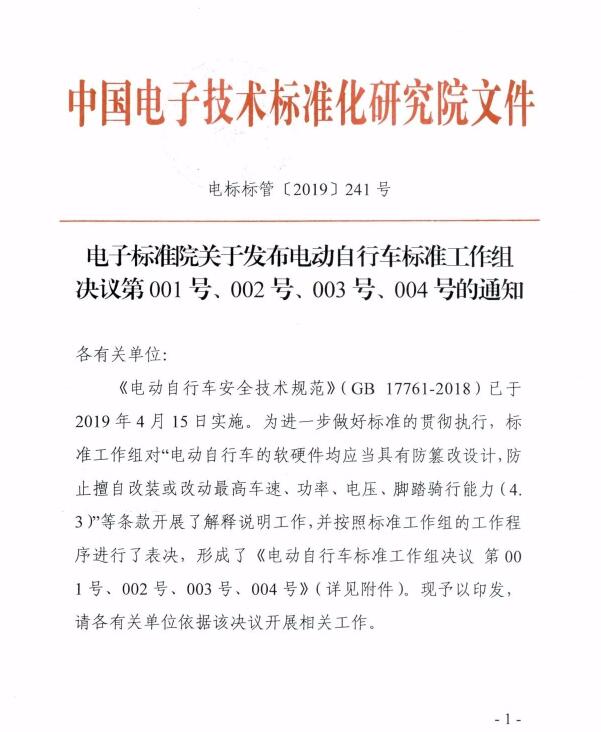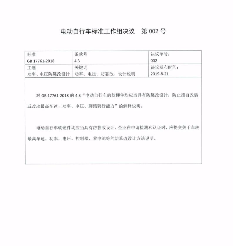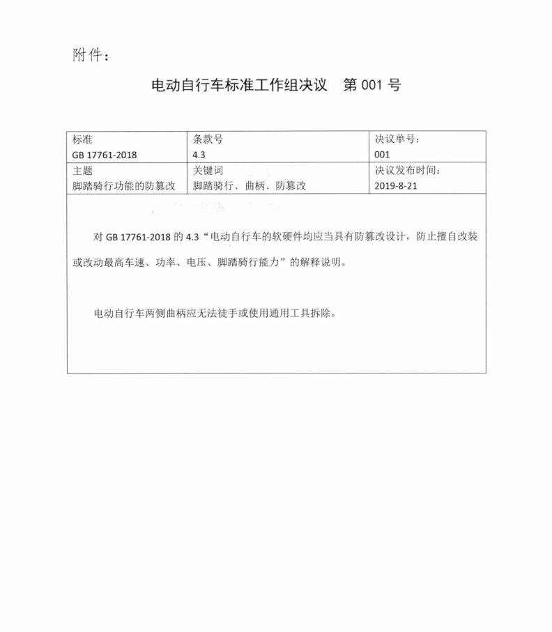 《電動自行車安全技術(shù)規(guī)范》(GB 17761-2018)已于2019年4月15日實施。為進一步做好標(biāo)準(zhǔn)的貫徹執(zhí)行,標(biāo)準(zhǔn)工作組對“電動自行車的軟硬件均應(yīng)當(dāng)具有防篡改設(shè)計,防止擅自改裝或改動最高車速、功率、電壓、腳踏騎行能力(4.3)”等條款開展了解釋說明工作,并按照標(biāo)準(zhǔn)工作組的工作程序進行了表決,形成了《電動自行車標(biāo)準(zhǔn)工作組決議 第001號、002號、003號、004號》(詳見附件)?,F(xiàn)予以印發(fā),請各有關(guān)單位依據(jù)該決議開展相關(guān)工作。