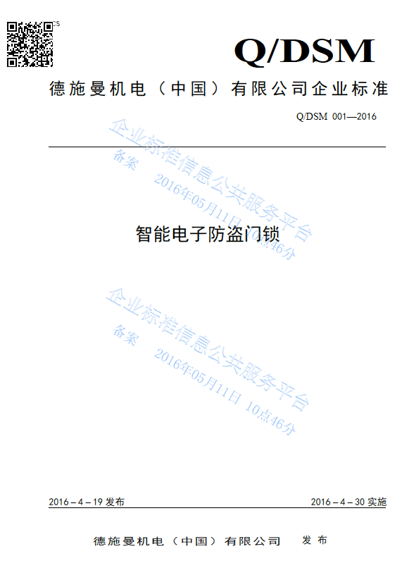 智能鎖相關(guān)的企業(yè)標(biāo)準(zhǔn)同樣眾多,比如:Q/DSM 001-2016《智能電子防盜門鎖》(德施曼機(jī)電(中國(guó))有限公司)、Q/GDMS001-2019《智能門鎖》(廣東曼申智能科技有限公司)等。