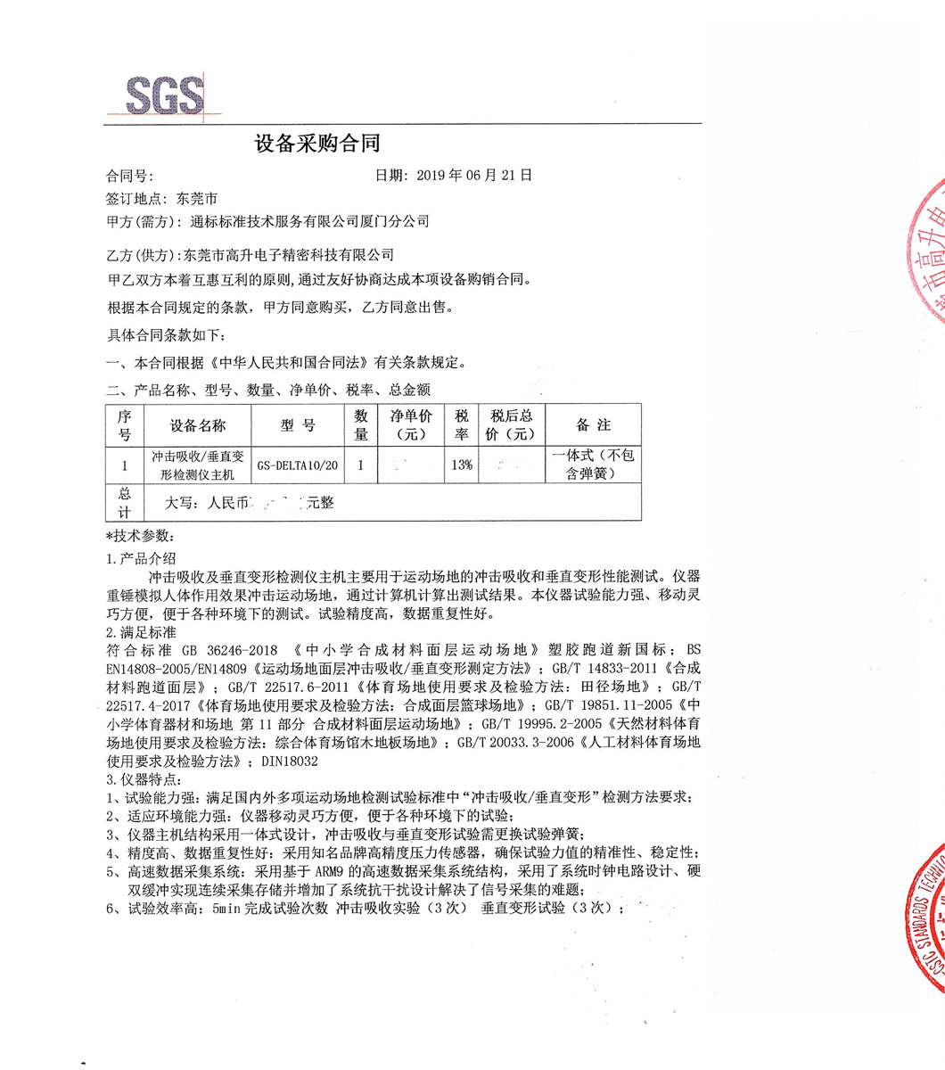 自2018年10月與上海(必維)國際集團(tuán)檢測有限公司(法國BV實(shí)驗(yàn)室)完美合作之后,Delta德爾塔儀器在塑膠跑道運(yùn)動(dòng)場地材料領(lǐng)域新增另一家重量級(jí)跨國第三方檢測機(jī)構(gòu)客戶:通標(biāo)標(biāo)準(zhǔn)技術(shù)服務(wù)有限公司廈門分公司,SGS廈門分公司材料實(shí)驗(yàn)室于近期擴(kuò)項(xiàng)了塑膠跑道新國標(biāo)GB36246-2018全項(xiàng)目檢測能力。廈門SGS分公司經(jīng)過多輪對供應(yīng)商嚴(yán)格篩選、考察比較、實(shí)驗(yàn)數(shù)據(jù)比對,最后排除進(jìn)口5A、3A、2A等同類儀器,選擇我司最新便攜式“DELTA10/20型沖擊吸收與垂直變形檢測儀”,我們在此對客戶的信任和支持表示衷心的感謝, 我們將以最優(yōu)良的產(chǎn)品和最優(yōu)質(zhì)的售后服務(wù)回報(bào)客戶!