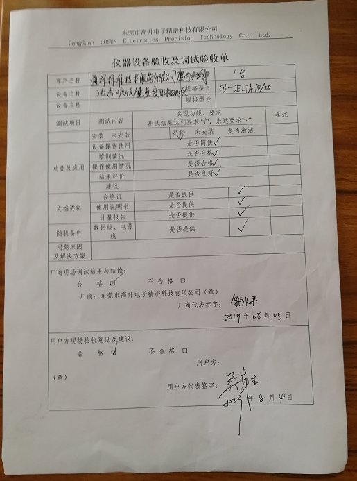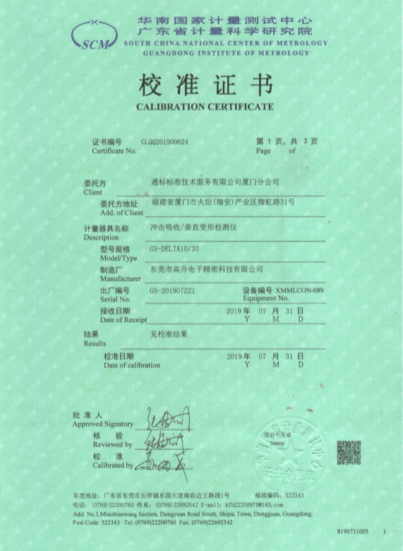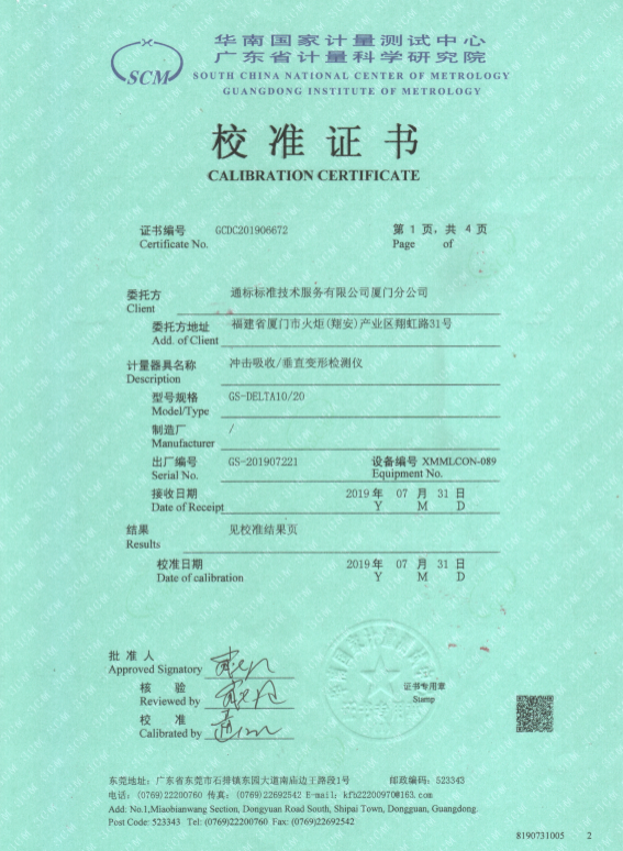 從訂單簽訂到生產(chǎn)、調(diào)試、計(jì)量校準(zhǔn)、培訓(xùn)售后,Delta德爾塔儀器自上到下高度重視,快速高效的完成了客戶的委托,并成功在華南國家計(jì)量測試中心取得了該中心首份“沖擊吸收與垂直變形檢測儀”合格計(jì)量證書,獲得了SGS廈門實(shí)驗(yàn)室領(lǐng)導(dǎo)的一致好評。