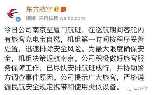 2019年9月4日,MU2809南京-廈門航班,07:16在南京祿口國(guó)際機(jī)場(chǎng)起飛。飛機(jī)起飛后,因一名旅客攜帶的充電寶起火冒煙并觸發(fā)煙霧警告,乘務(wù)組按程序處置將火撲滅,飛機(jī)需要返航,并于08:24正常落地南京祿口機(jī)場(chǎng),事件原因公安機(jī)關(guān)正在調(diào)查之中。