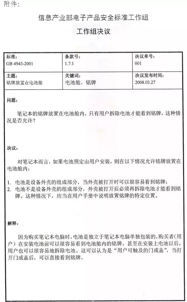 ■第001號(hào)決議:GB 4943-2001第1.7.1條“銘牌放置在電池艙”