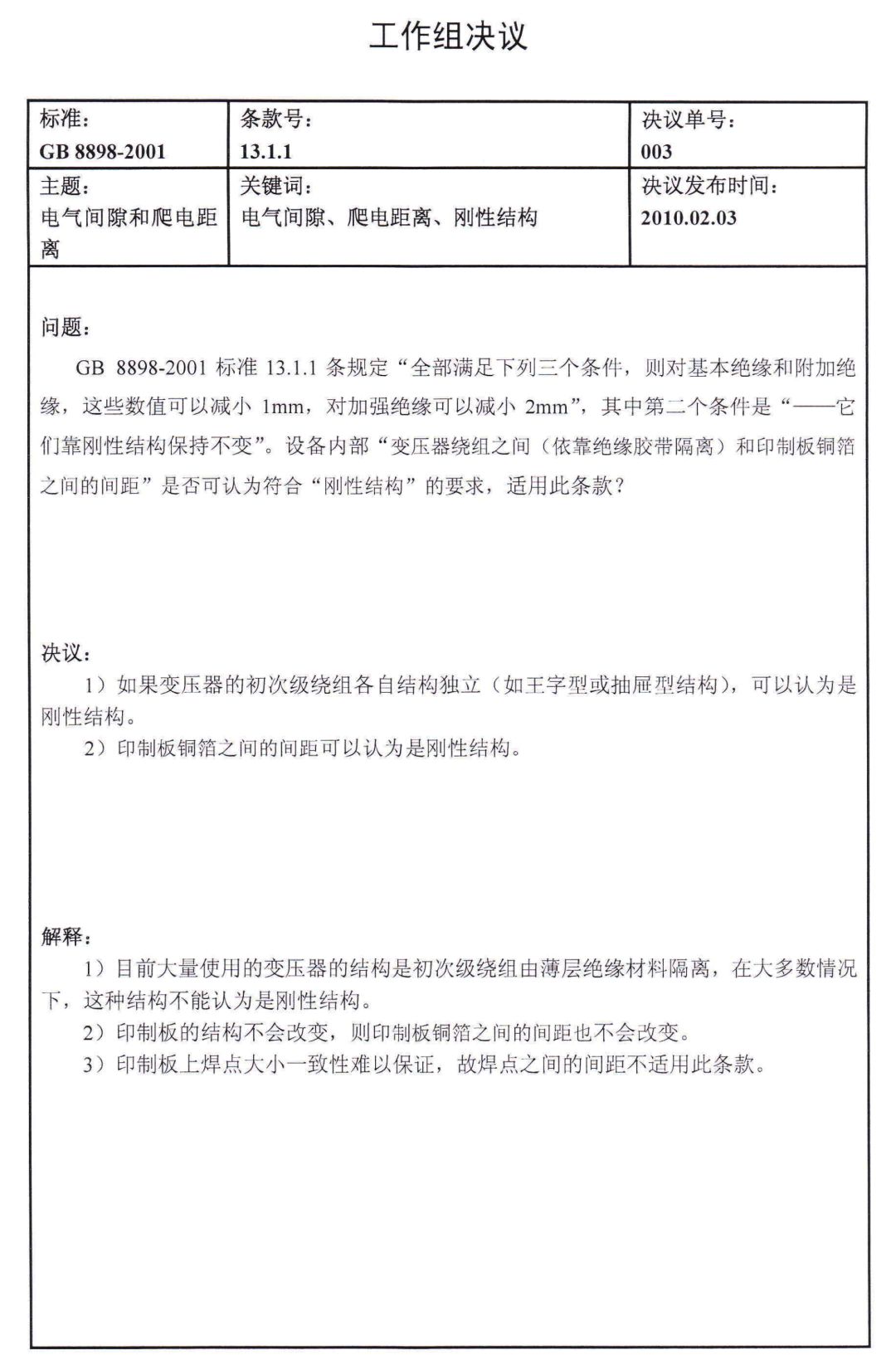 ■第003號(hào)決議:GB 8898-2001第13.1.1條“電氣間隙和爬電距離”