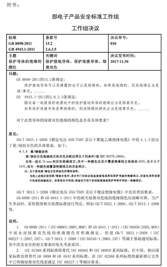 ■第010號(hào)決議:GB 8898-2011和GB 4943.1-2011,第15.2條和第2.6.3.5條“綠黃雙色線”