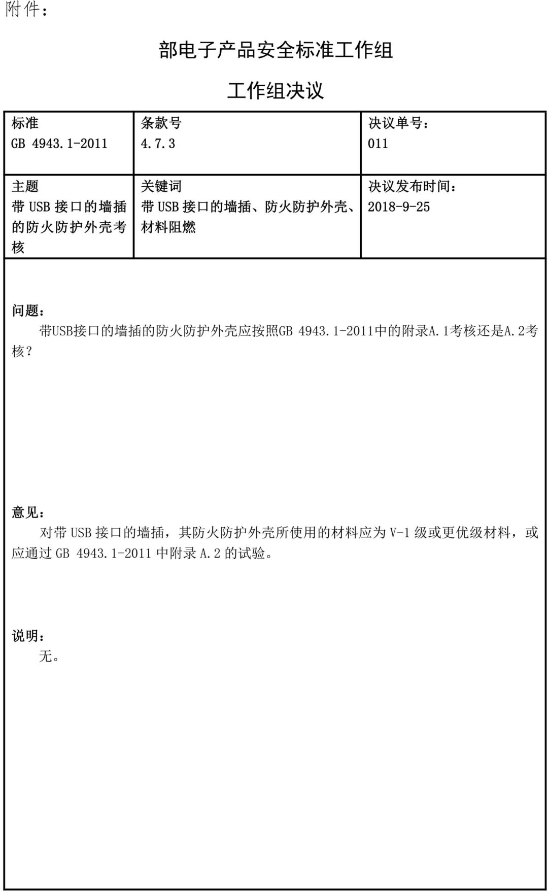 ■第011號(hào)決議:GB 4943.1-2011第4.7.3條“帶USB插口的墻插的防火防護(hù)外殼考核”