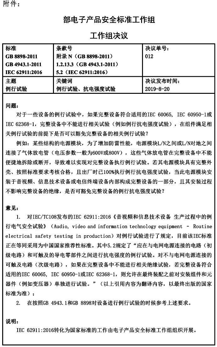 ■第012號(hào)決議:GB 8898-2011附錄N等“例行試驗(yàn)”