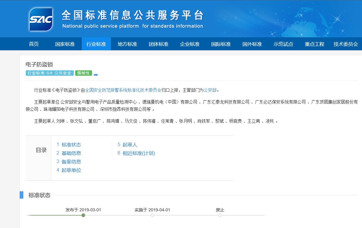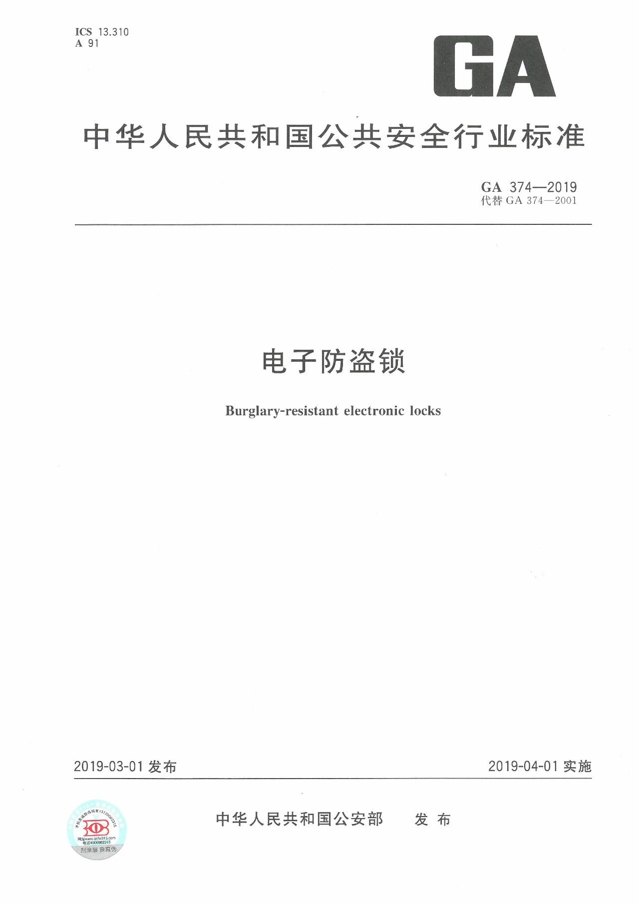 據(jù)了解,行業(yè)標(biāo)準(zhǔn)GA374-2019《電子防盜鎖》已于2019年4月1日實(shí)施。該行業(yè)標(biāo)準(zhǔn)由全國(guó)安全防范報(bào)警系統(tǒng)標(biāo)準(zhǔn)化技術(shù)委員會(huì)歸口上報(bào),主管部門(mén)為公安部。