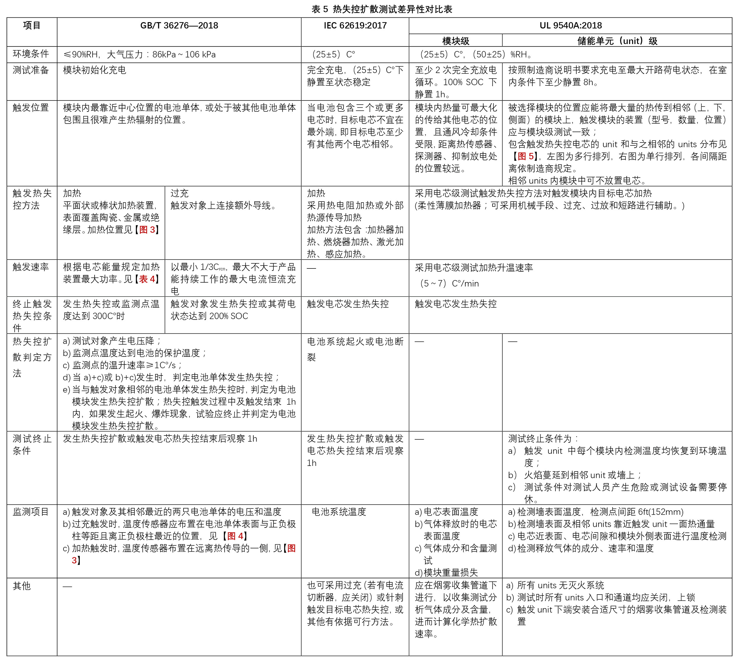 目前,包含儲(chǔ)能用電池?zé)崾Э匾蠛蜏y(cè)試方法的相關(guān)標(biāo)準(zhǔn)有GB/T 36276—2018, UL 9540A:2018,UL 1973:2018,各標(biāo)準(zhǔn)應(yīng)用情境不盡相同,因此在技術(shù)要求、觸發(fā)熱失控方法、測(cè)試手段等方面存在差異,差異性匯總?cè)绫?所示▼