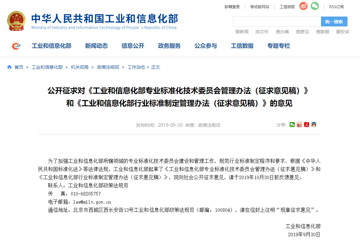 近日,工業(yè)和信息化部發(fā)布了《工業(yè)和信息化部行業(yè)標準制定管理辦法(征求意見稿)》(以下簡稱《管理辦法》),向社會公開征求意見,截止時間為10月30日。