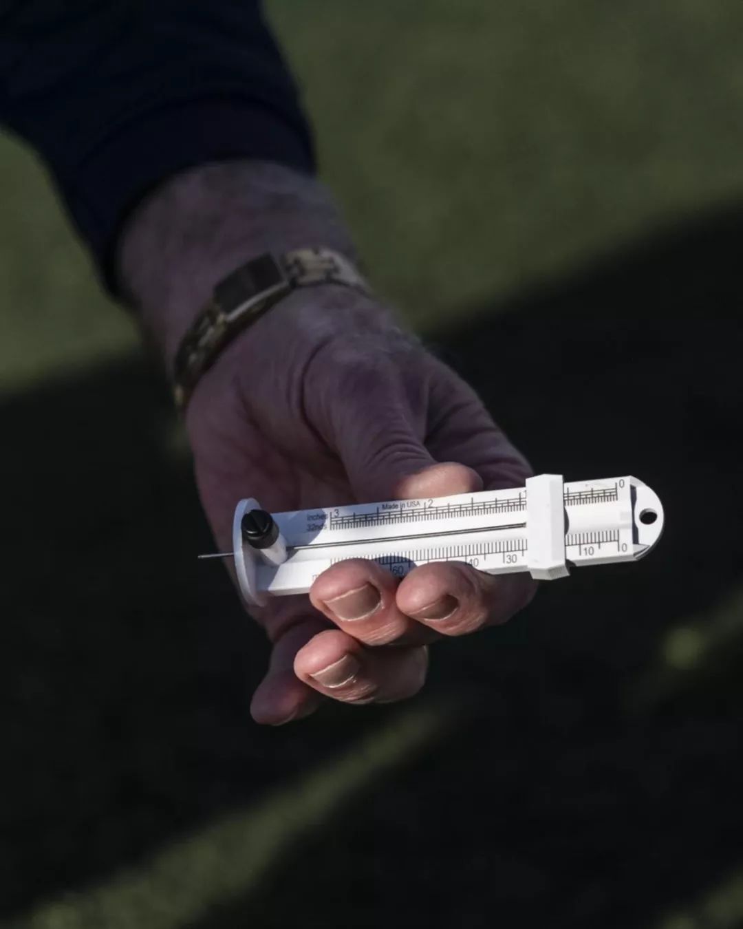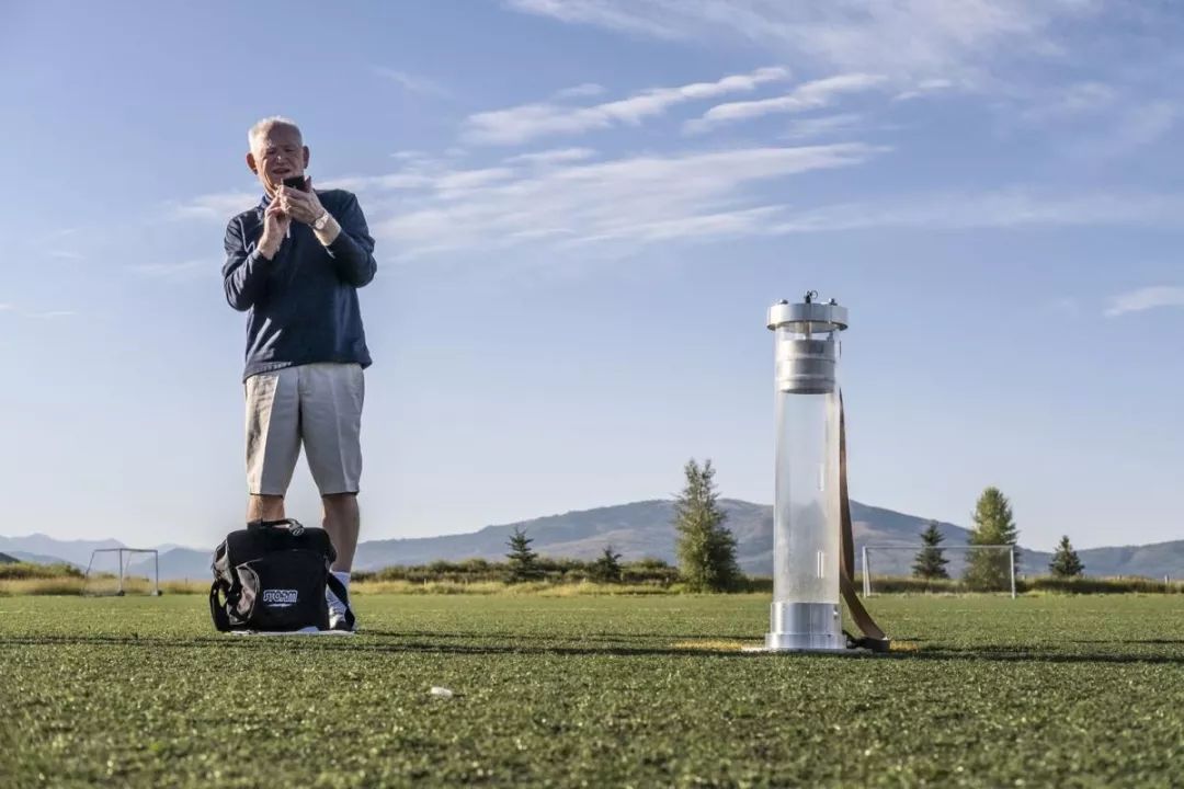 這個(gè)測(cè)試設(shè)備看起來(lái)有點(diǎn)像追擊炮的炮管,它的頂部懸掛著約9公斤的重物。按下按鈕后,重物就從管子里掉下去,重重地摔在草皮上。幾乎就在瞬間,重物向Splittgerber手中的電子設(shè)備發(fā)送了一個(gè)沖擊衰減讀數(shù),也就是Gmax值,來(lái)衡量運(yùn)動(dòng)場(chǎng)地的沖擊吸收能力。
