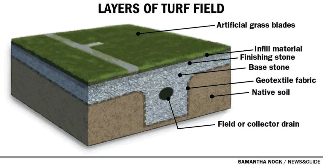 簡(jiǎn)單來(lái)說(shuō),人造草坪是先鋪設(shè)基礎(chǔ)層——由碎石和瀝青或混凝土組成,然后在上面鋪設(shè)草皮——由背襯和附著在上面的草纖維組成。為了減震,草纖維中需要加入橡膠顆粒填充物。一些場(chǎng)地也會(huì)在基礎(chǔ)層和草皮之間鋪上一層減震墊,以更好地減緩沖擊。