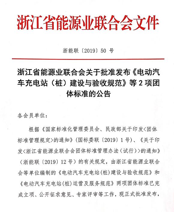 根據(jù)《國(guó)家標(biāo)準(zhǔn)化管理委員會(huì)、民政部關(guān)于印發(fā)<團(tuán)體標(biāo)準(zhǔn)管理規(guī)定>的通知》(國(guó)標(biāo)委聯(lián)〔2019〕1號(hào))、《關(guān)于印發(fā)<浙江省能源業(yè)聯(lián)合會(huì)團(tuán)體標(biāo)準(zhǔn)管理辦法(試行)>的通知》(浙能聯(lián)〔2019〕12號(hào))的有關(guān)規(guī)定,由浙江省能源業(yè)聯(lián)合會(huì)等單位編制的《電動(dòng)汽車充電站(樁)建設(shè)與驗(yàn)收規(guī)范》和《電動(dòng)汽車充電站(樁)運(yùn)營(yíng)及服務(wù)規(guī)范》兩項(xiàng)團(tuán)體標(biāo)準(zhǔn)已完成立項(xiàng)、公開征求意見、專家評(píng)審等工作,現(xiàn)正式批準(zhǔn)發(fā)布,標(biāo)準(zhǔn)編號(hào)分別為T/ZNL 001-2019、T/ZNL 002-2019,兩項(xiàng)標(biāo)準(zhǔn)于2019-10-31發(fā)布,2019-11-30實(shí)施。