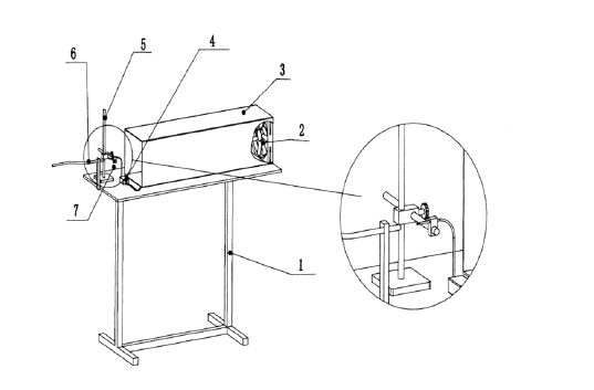 1—測試風(fēng)洞支架、2—風(fēng)機(jī)、3—測試風(fēng)洞外殼、4—發(fā)生器、5—可調(diào)整支架、6—臭氧分析儀的采樣管、7—發(fā)生器發(fā)射級(jí)。