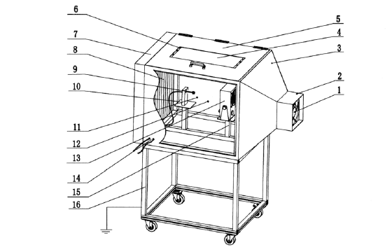 1——風(fēng)機(jī)、2——風(fēng)管、3——測試艙外殼、4——觀察窗、5——測試艙門、6——艙內(nèi)照明、7——引風(fēng)口、8——高效空氣過濾器、9——發(fā)生器、10——發(fā)生器支架、11——風(fēng)速儀測試口、12——激光粒子計(jì)數(shù)器測試口、13——空氣離子測量儀、14——供電入口、15——空氣離子測量儀支架、16——測試艙支架。