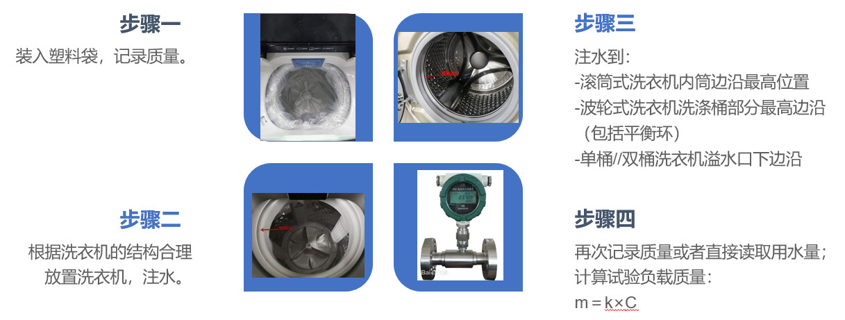 自動注水洗衣機(jī),放負(fù)載后注水并測量洗滌水量;手動注水洗衣機(jī),在空載下注水并測量洗滌水量。