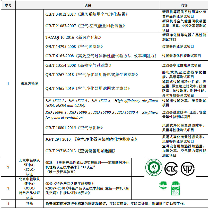 試驗(yàn)室自2017年起就作為核心骨干參與制定QB/T 5267-2018《空氣凈化器用靜電式集塵過濾器》和QB/T 5365-2019《空氣凈化器用濾網(wǎng)式過濾器》,其后又陸續(xù)參與制訂了QB/T****-****《家用和類似用途新風(fēng)凈化機(jī)》及T/CAQI 86-2019《家用和類似用途新風(fēng)機(jī)空氣清新度技術(shù)要求及試驗(yàn)方法》。