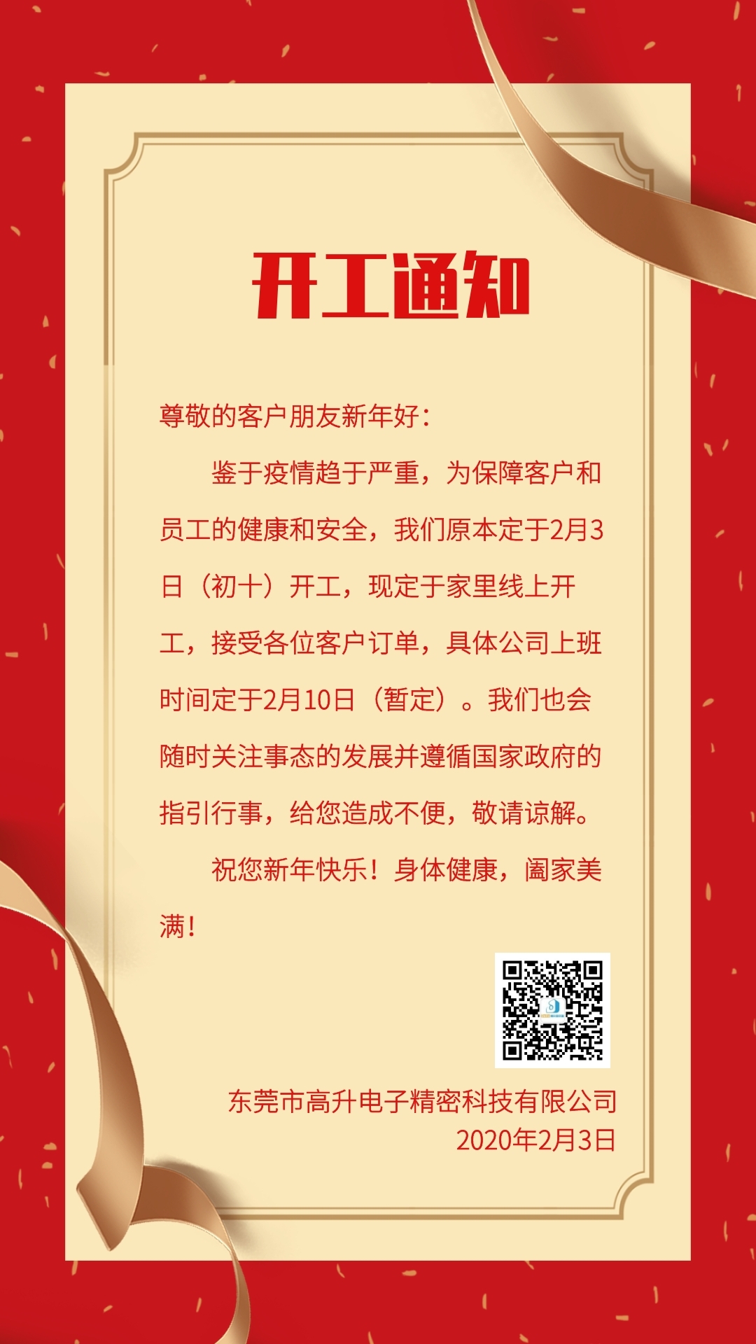 鑒于疫情趨于嚴(yán)重,為保障客戶和員工的健康和安全,我們?cè)径ㄓ?月3日(初十)開工,現(xiàn)定于家里線上開工,接受各位客戶訂單,具體公司上班時(shí)間定于2月10日(暫定)。我們也會(huì)隨時(shí)關(guān)注事態(tài)的發(fā)展并遵循國家政府的指引行事,給您造成不便,敬請(qǐng)諒解。
