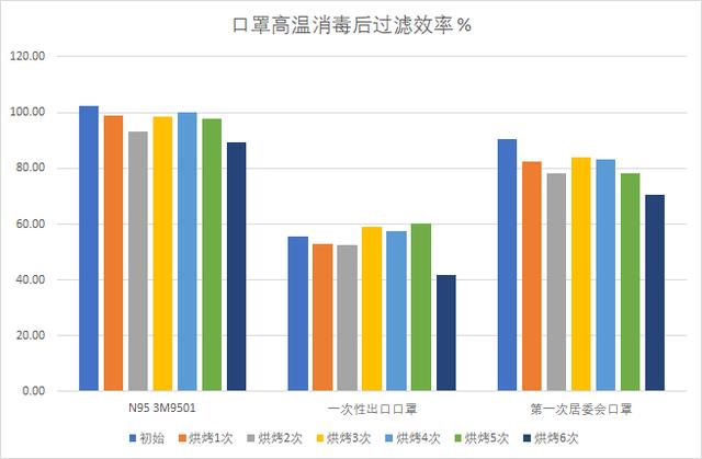 如上下降效率最大的貢獻(xiàn)是2次100度高溫烘烤,實(shí)際中間幾次80烘烤對(duì)效率的影響是很小的。第二次烘烤之后這些樣品統(tǒng)一都拿到TSI 8130上測(cè)過過濾效率,KN95 3M9501還有97%的過濾效率,所有樣品過濾阻力都沒有增加,畢竟我們現(xiàn)在主要是為了防病毒,外面停工停學(xué)了空氣質(zhì)量好得不得了,不會(huì)有顆粒物過多導(dǎo)致口罩堵塞阻力加大的情況發(fā)生。