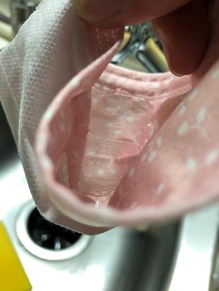 我挑了一個(gè)確定沒有任何過濾效率的一次性口罩,這個(gè)是佳綠的,在TSI8130上測(cè)試確認(rèn)過濾效率是0,看起來做工還行的,就是表面摸起來有點(diǎn)絲綢的感覺。用視頻里流行的方法去盛水,不漏。噴過酒精后,馬上盛水,是漏的。但是如果晾一天,等酒精揮發(fā)完了之后再次盛水,又不漏了。這就是做個(gè)好玩,實(shí)際沒有任何意義。