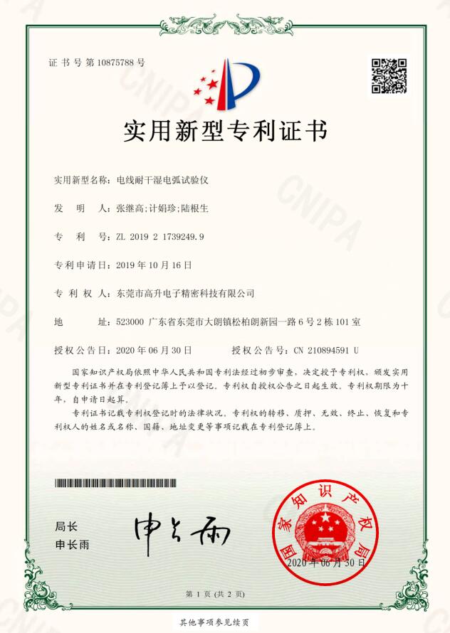 以下為“電線耐干濕電弧試驗(yàn)儀”專利證書展示: