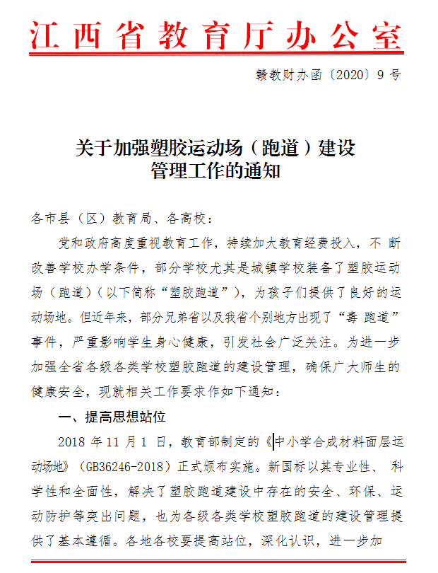 近日,江西省教育廳下發(fā)《關(guān)于加強(qiáng)塑膠運(yùn)動(dòng)場(chǎng)(跑道)建設(shè)管理工作的通知》,將對(duì)所有在建或竣工的塑膠跑道開(kāi)展安全質(zhì)量大排查,及時(shí)處置發(fā)現(xiàn)的異常情況,為校園健康保駕護(hù)航。