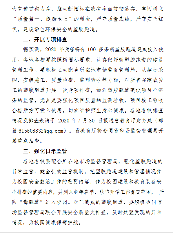 《通知》指出,全省各地各校要提高站位,深化認(rèn)識(shí),進(jìn)一步加大宣傳貫徹力度,推動(dòng)新國(guó)標(biāo)的全面貫徹落實(shí),牢固樹(shù)立“質(zhì)量第一、健康至上”的理念,嚴(yán)守質(zhì)量底線,嚴(yán)守安全紅線,建設(shè)綠色環(huán)保安全的塑膠跑道。