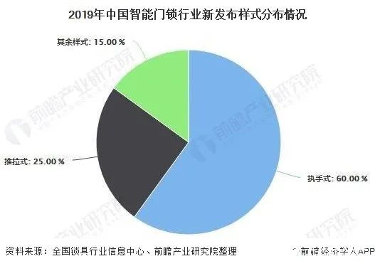 從智能鎖樣式來看,2019年,新品智能鎖發(fā)布160余款,其中智能鎖樣式中,執(zhí)手式占較大比重,達(dá)到60%;其次是推拉式,占比約25%。