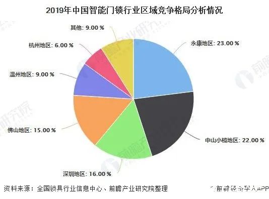 智能鎖區(qū)域競(jìng)爭格局方面,據(jù)全國制鎖行業(yè)信息中心的數(shù)據(jù),智能鎖主要集中在永康、溫州、杭州、深圳、中山、佛山等地。浙江永康因其背靠門廠需求,2019年產(chǎn)銷量占比最高,達(dá)到23%;廣東中山因其有著傳統(tǒng)五金行業(yè)以及新興企業(yè)、供應(yīng)鏈等諸多優(yōu)勢(shì),產(chǎn)銷量占比次之,中山小欖地區(qū)產(chǎn)銷量占比達(dá)到22%。2019年各大智能鎖產(chǎn)地銷量排名依次為:永康、中山、深圳等。
