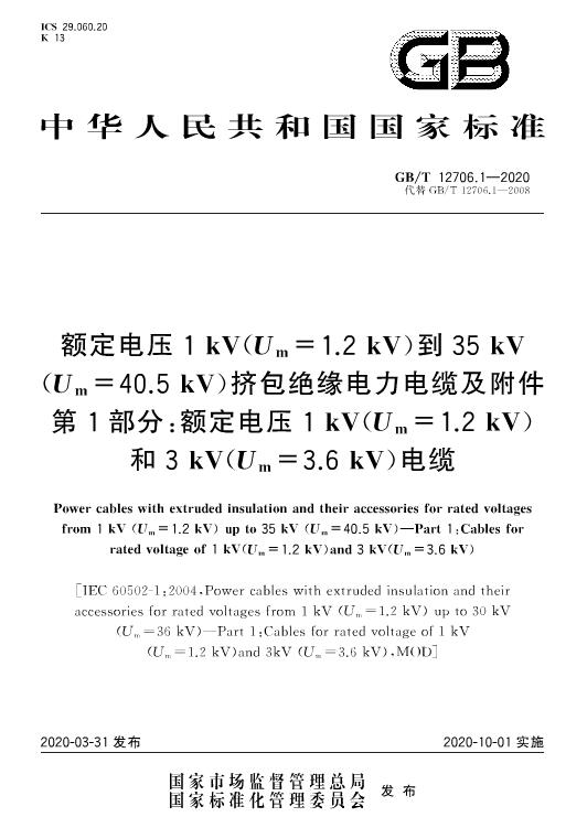 1、GB/T 12706.1-2020 額定電壓1 kV(Um=1.2 kV)到35 kV(Um=40.5 kV)擠包絕緣電力電纜及附件 第1部分:額定電壓1 kV(Um=1.2 kV)和3 kV(Um=3.6 kV)電纜;