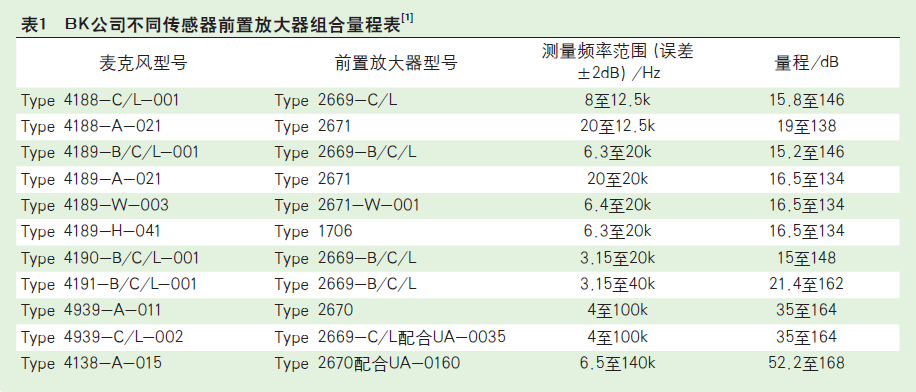 我們非常關(guān)注噪聲測試結(jié)果的準確性,即測量值與實際值的偏差。偏差來源于很多方面,家電噪聲由于其數(shù)值較小,因此其中最主要的偏差來源于背景噪聲。在國際與國內(nèi)標準中,將除了被測聲源之外所有其他聲源貢獻的噪聲,稱為背景噪聲。背景噪聲主要包含兩部分,一部分是環(huán)境中其他聲源產(chǎn)生的噪聲,比如消聲室的環(huán)境本底噪聲,如圖1為某消聲室的環(huán)境本底噪聲測量結(jié)果,其中橫坐標為各個頻段的中心頻率,縱坐標為各頻段的本底噪聲大小;另一部分是測量儀器帶來的電噪聲,這是人們往往忽略的一部分。比如對于傳感器來說,其本身的電噪聲基本上決定了量程的下限,表1展示了BK公司不同傳感器與前置放大器的組合的量程。