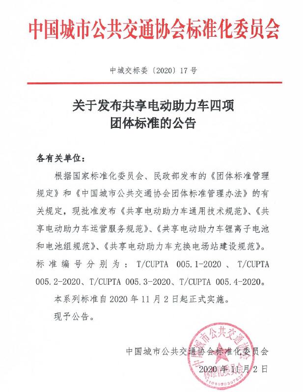 該系列標(biāo)準(zhǔn)由四項(xiàng)團(tuán)體標(biāo)準(zhǔn)組成,分別為《共享電動(dòng)助力車(chē)通用技術(shù)規(guī)范》、《共享電動(dòng)助力車(chē)運(yùn)營(yíng)服務(wù)規(guī)范》、《共享電動(dòng)助力車(chē)鋰離子電池和電池組規(guī)范》、《共享電動(dòng)助力車(chē)充換電場(chǎng)站建設(shè)規(guī)范》。