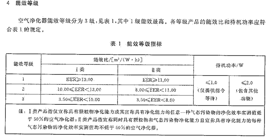 技術(shù)指標包括能效比和待機功率,空氣凈化器能效等級分為3級,其中1級能效最高,各等級產(chǎn)品的能效比和待機功率應(yīng)符合標準表1的規(guī)定。