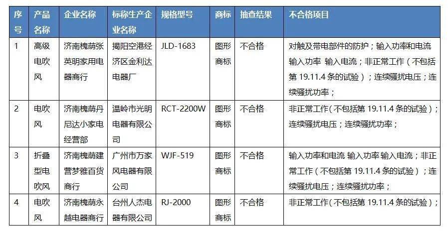 山東省市場監(jiān)督管理局網(wǎng)站公布本次共抽查了全省9家企業(yè)10批次電吹風(fēng)產(chǎn)品,其中,流通領(lǐng)域9家企業(yè)10批次。抽查發(fā)現(xiàn)4家企業(yè)的4批次產(chǎn)品不符合相關(guān)標(biāo)準(zhǔn)的要求,不合格項(xiàng)目為對觸及帶電部件的防護(hù)、輸入功率和電流、非正常工作、連續(xù)騷擾電壓、連續(xù)騷擾功率項(xiàng)目。