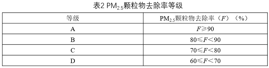 空氣凈化器在現(xiàn)場環(huán)境下的PM2.5顆粒物去除率應(yīng)符合表2的規(guī)定,應(yīng)至少達到表2規(guī)定的D級要求。