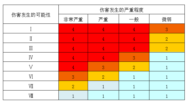 嚴(yán)重程度表格的建立是依據(jù)不同電子電器的特點(diǎn),根據(jù)識(shí)別出的危害全面分析可能造成的傷害,并考慮不同傷害的嚴(yán)重程度,依次進(jìn)行傷害嚴(yán)重程度的等級(jí)劃分
