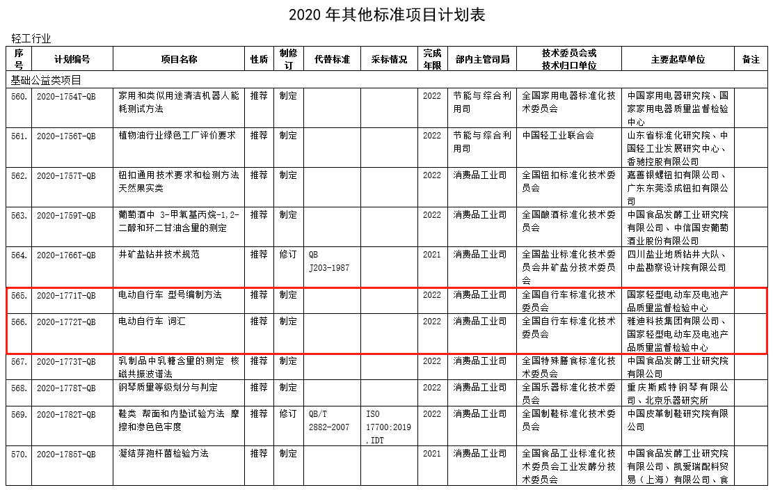 12月1日工業(yè)和信息化部發(fā)布《2020年第三批行業(yè)標(biāo)準(zhǔn)制修訂和外文版項(xiàng)目計(jì)劃》(工信廳科函〔2020〕263號(hào))共下達(dá)801項(xiàng)計(jì)劃任務(wù),其中涉及自行車行業(yè)的有兩項(xiàng):《電動(dòng)自行車 型號(hào)編制方法》和《電動(dòng)自行車 詞匯》,兩項(xiàng)行業(yè)標(biāo)準(zhǔn)由全國(guó)自行車標(biāo)準(zhǔn)化技術(shù)委員會(huì)歸口并負(fù)責(zé)制定工作。標(biāo)準(zhǔn)主要起草單位分別由國(guó)家輕型電動(dòng)車及電池產(chǎn)品質(zhì)量監(jiān)督檢驗(yàn)中心、雅迪科技集團(tuán)有限公司擔(dān)任。